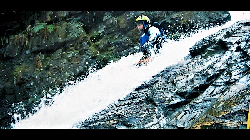Two remaining challenges await. A fun 10m slide into a refreshing pool. The extreme canyoning trip ends with scenic climb out along a beautiful cascading waterfall. Refreshing on a hot summers day. This brings us to the end of the best extreme canyoning days in Snowdonia and Wales!